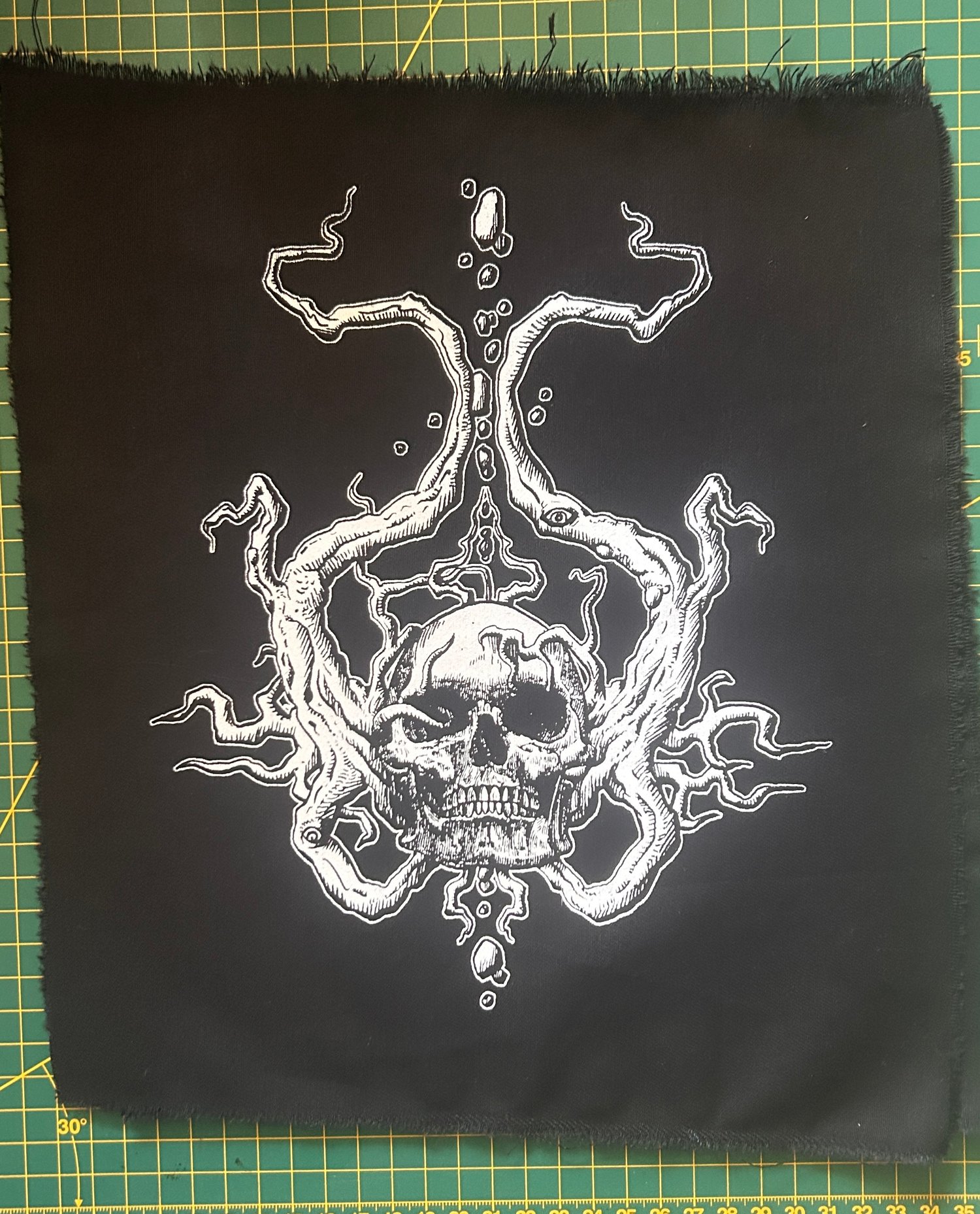 Fine quality hand screen printed back patch using eco-friendly inks and black cotton drill. Size: approx 27 X 30 cm ( cotton size)...perfect for the back of a battle jacket or any other application you can think of.