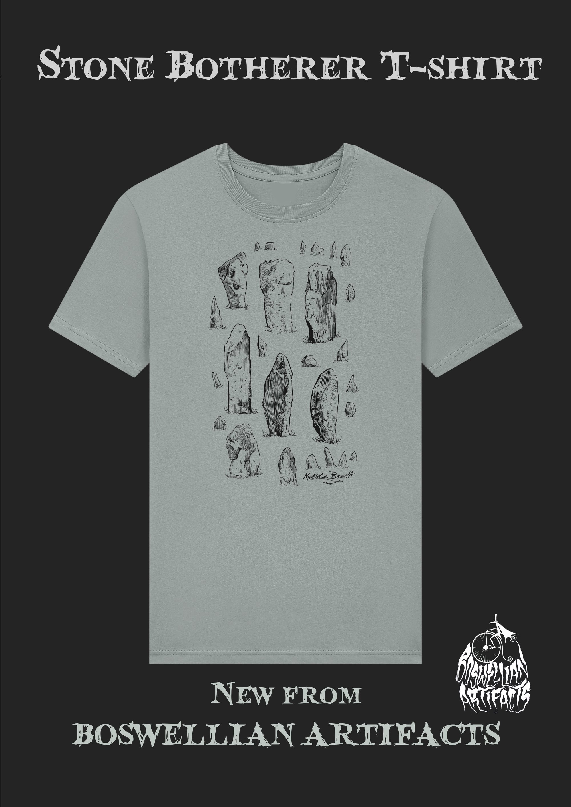 My Stone Botherer design printed in a dark grey on light grey Earth Positive T shirt. This fine design has been hand-screen-printed onto premium quality Earth Positive tee.